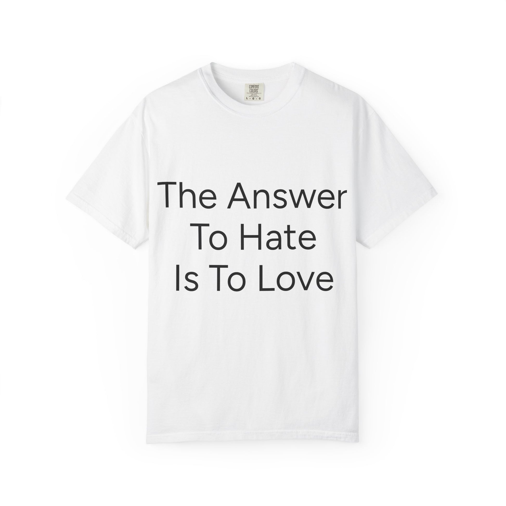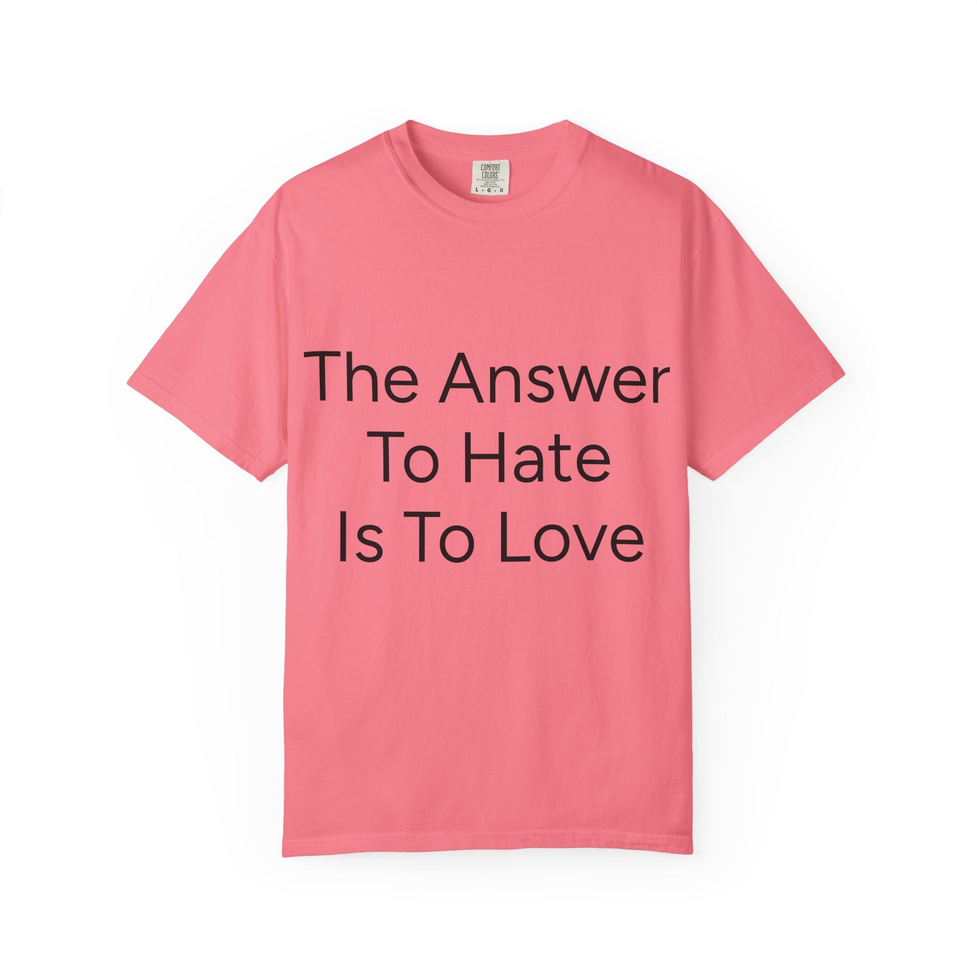 The Answer To Hate Is To Love unisex t-shirt with comfort colors promotes love instead of hate in our world today. This relaxed fit, medium fabric garment-dyed t-shirt is perfect for spreading positivity and comfort in daily wear. Ideal for individuals looking to make a statement against hate and promote love and kindness. Relevant for occasions such as peace rallies, awareness events, and everyday casual wear.