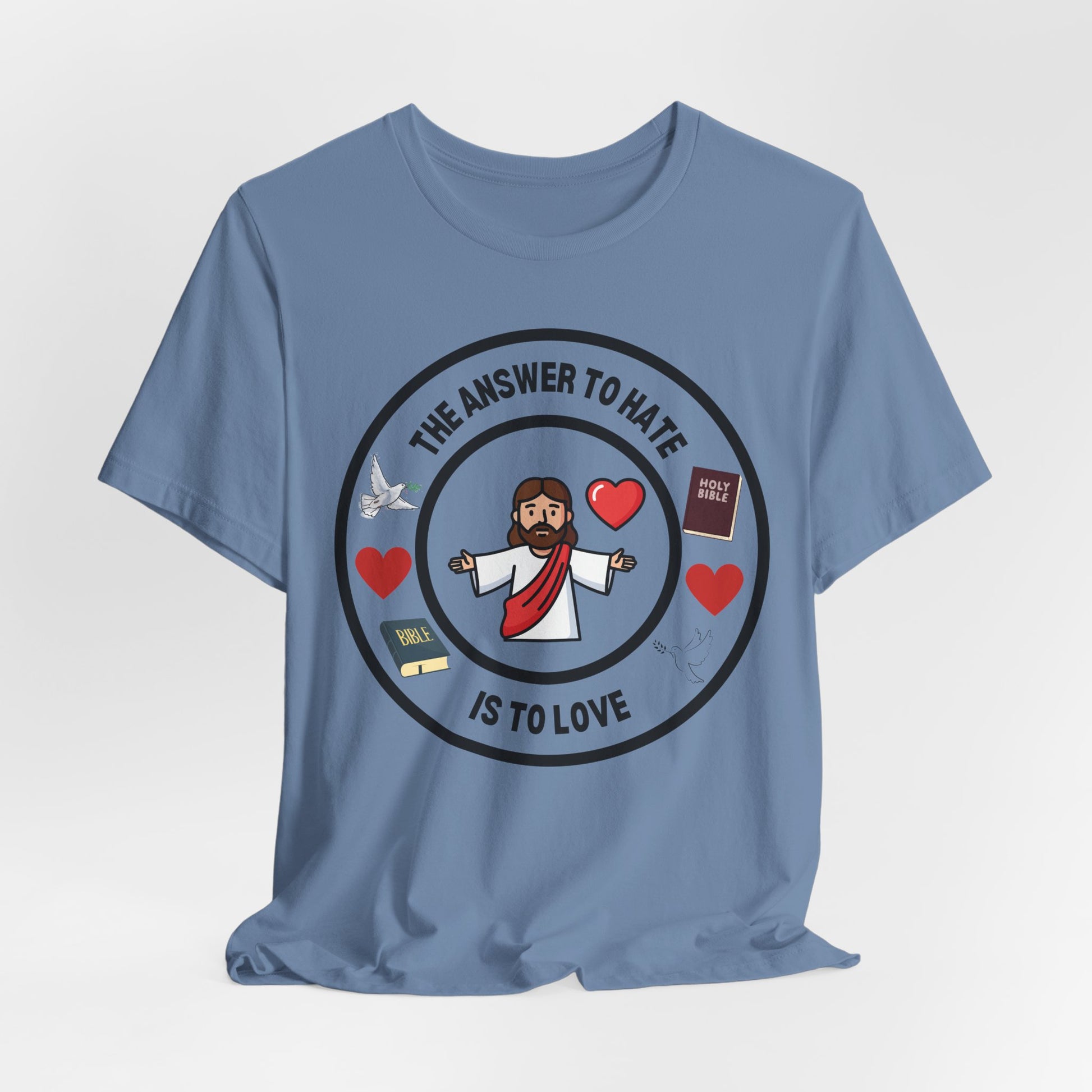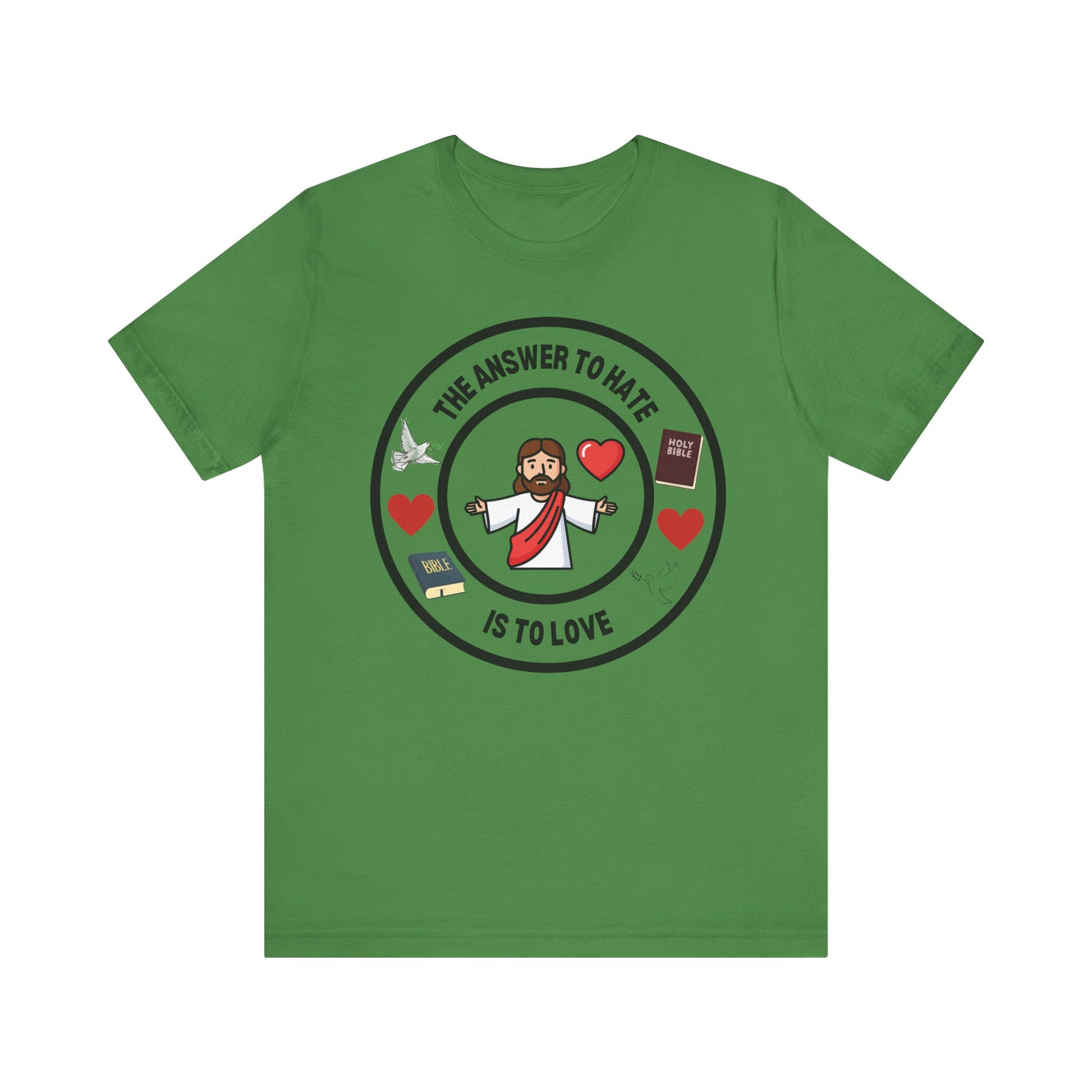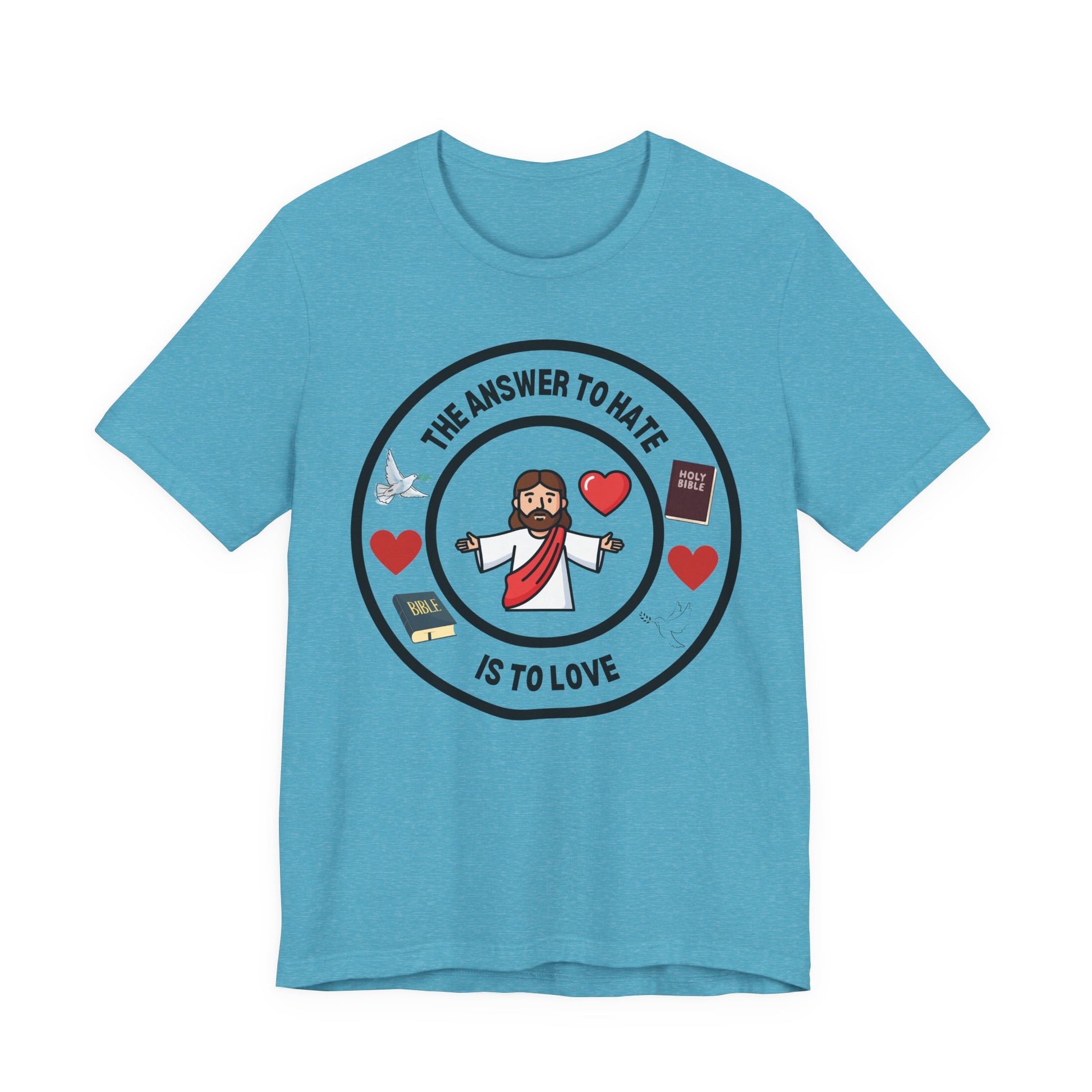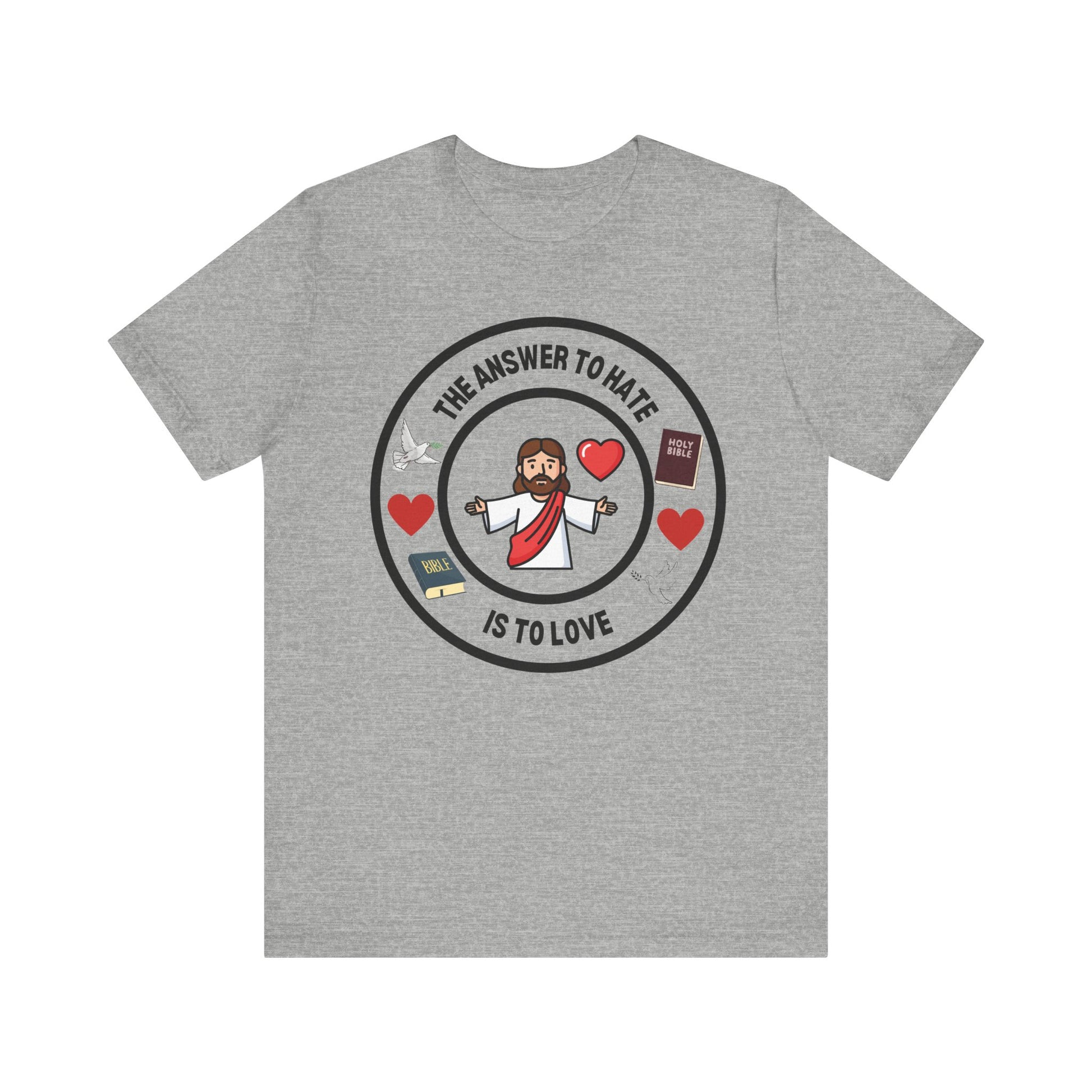 The Answer To Hate Is To Love unisex t-shirt featuring Jesus outstretching his arms, bibles, peace doves, and hearts. This t-shirt exudes a message of love and peace, making it a perfect addition to the wardrobe of those who want to spread positivity and faith. Ideal for Christians, believers, and those who celebrate religious holidays and events.