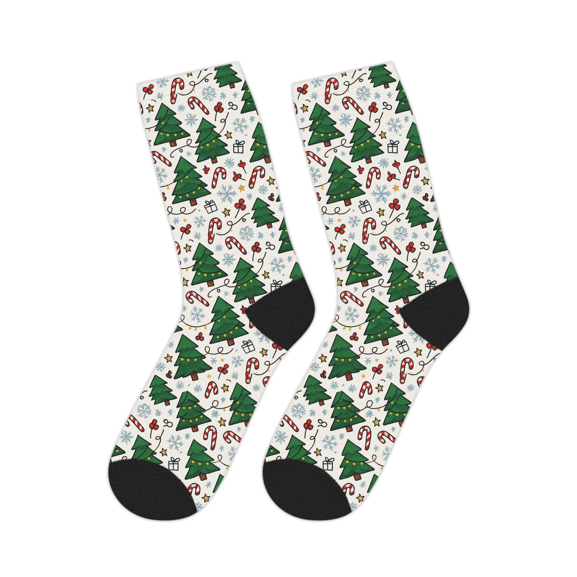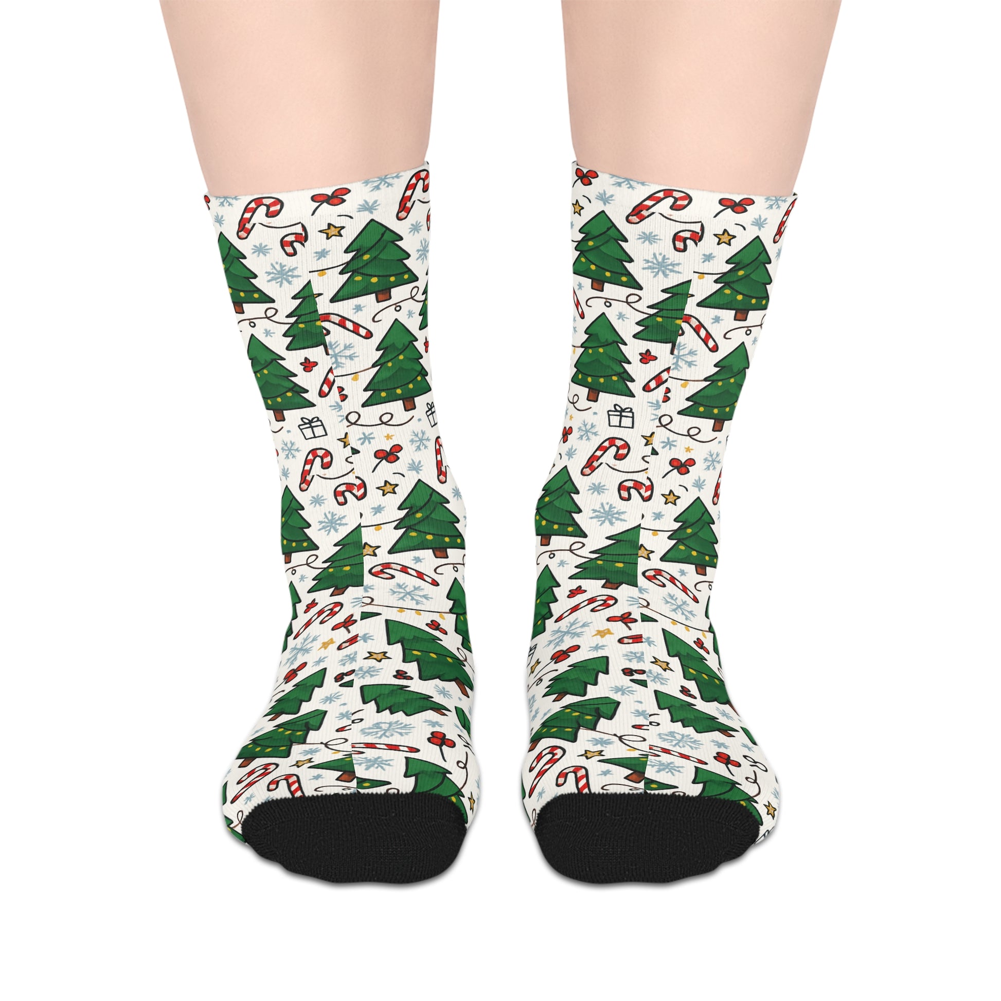 These mid-length socks bring cozy holiday cheer to everyday wear. Soft, lightweight polyester holds a lively all-over print of evergreen trees, candy canes, tiny presents, and snowflakes on a clean white background. The crew-style length sits comfortably mid-calf, with contrasting black heels and toes for a playful, finished look. Wear them around the house while wrapping gifts, under boots on a winter market stroll, or peeking out from leggings during a casual holiday party. The pattern is cheerful without being loud — like a quiet snowfall sprinkled with festive bits — and they hold their shape and dry quickly so they stay ready for the season.