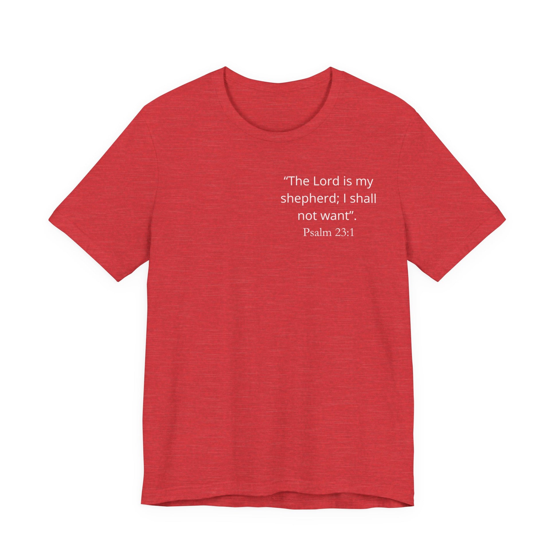 This classic unisex crewneck T-shirt subtly shares your faith with the inspirational Psalm 23:1 quote 'The Lord is My Shepherd I shall not want.' It is perfect for those who want to express their beliefs in a quiet and meaningful way. Ideal for Christians looking to incorporate their faith into their everyday wardrobe, this tee is suitable for casual wear or as a conversation starter during church events, Bible studies, and religious holidays.