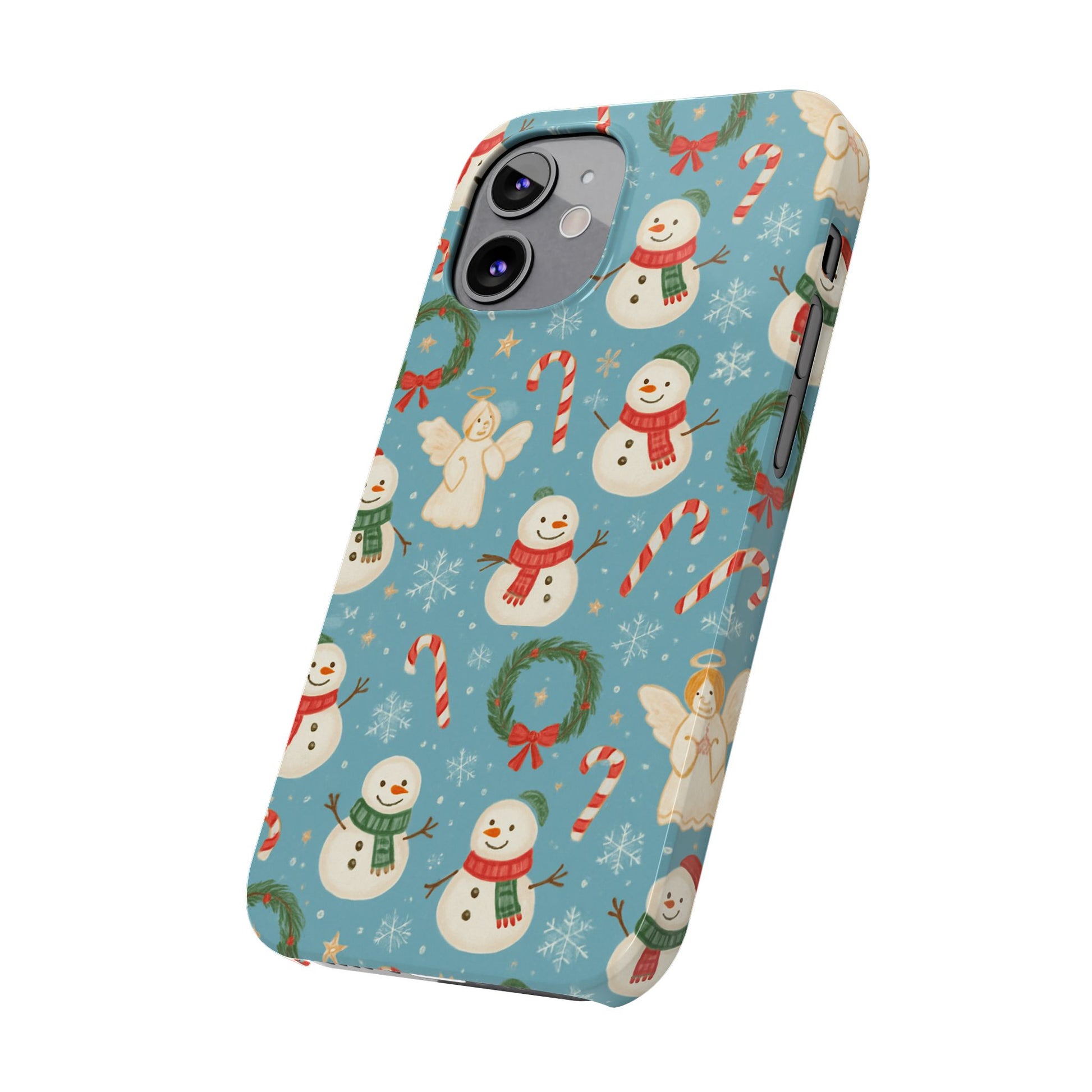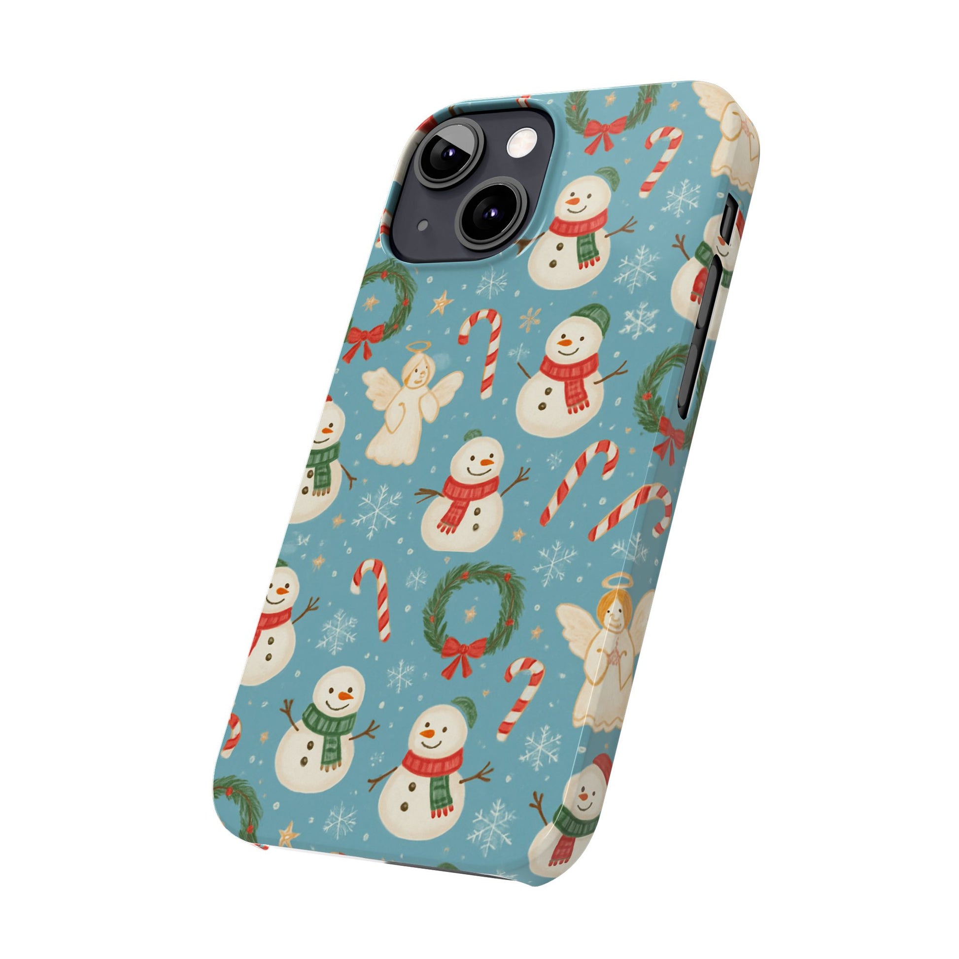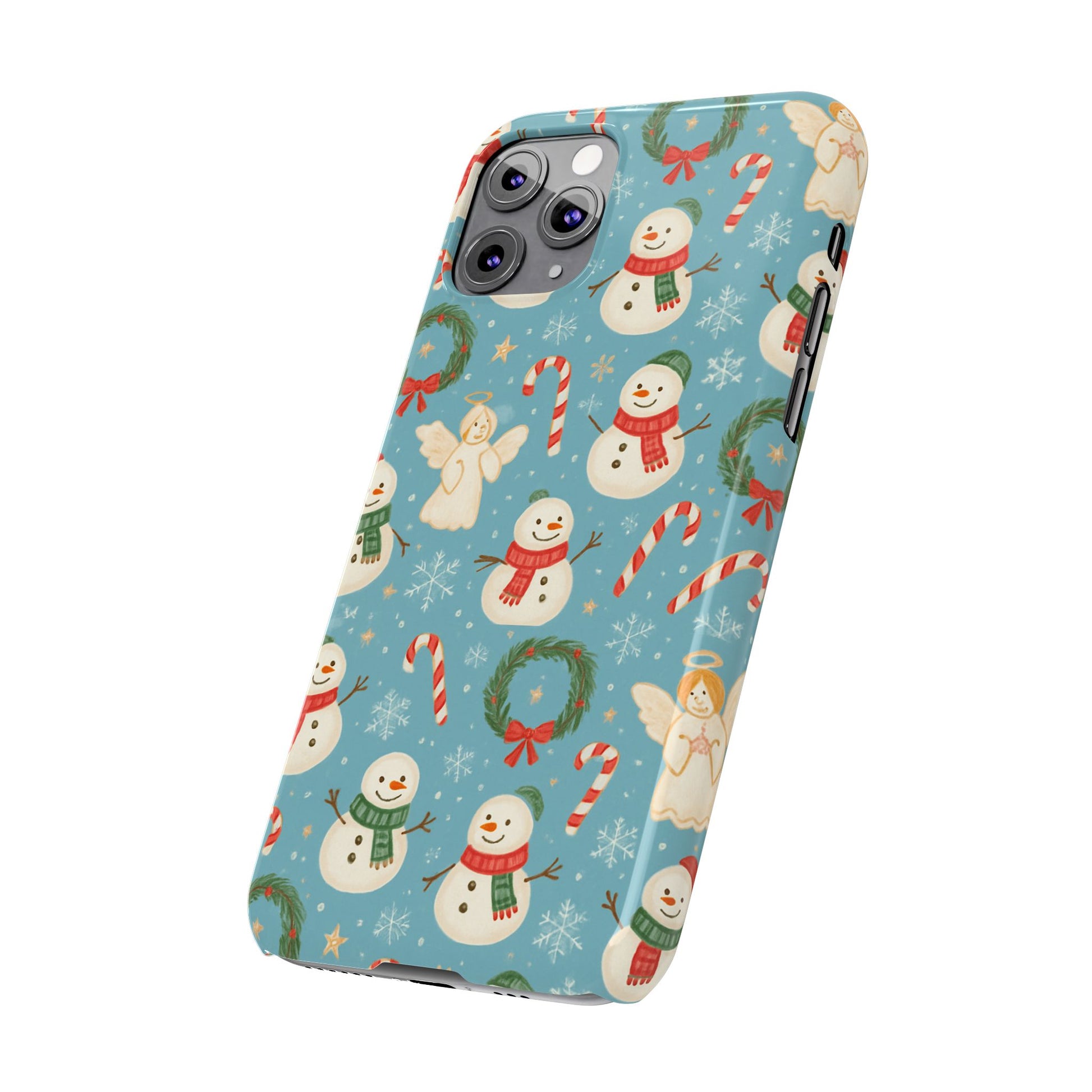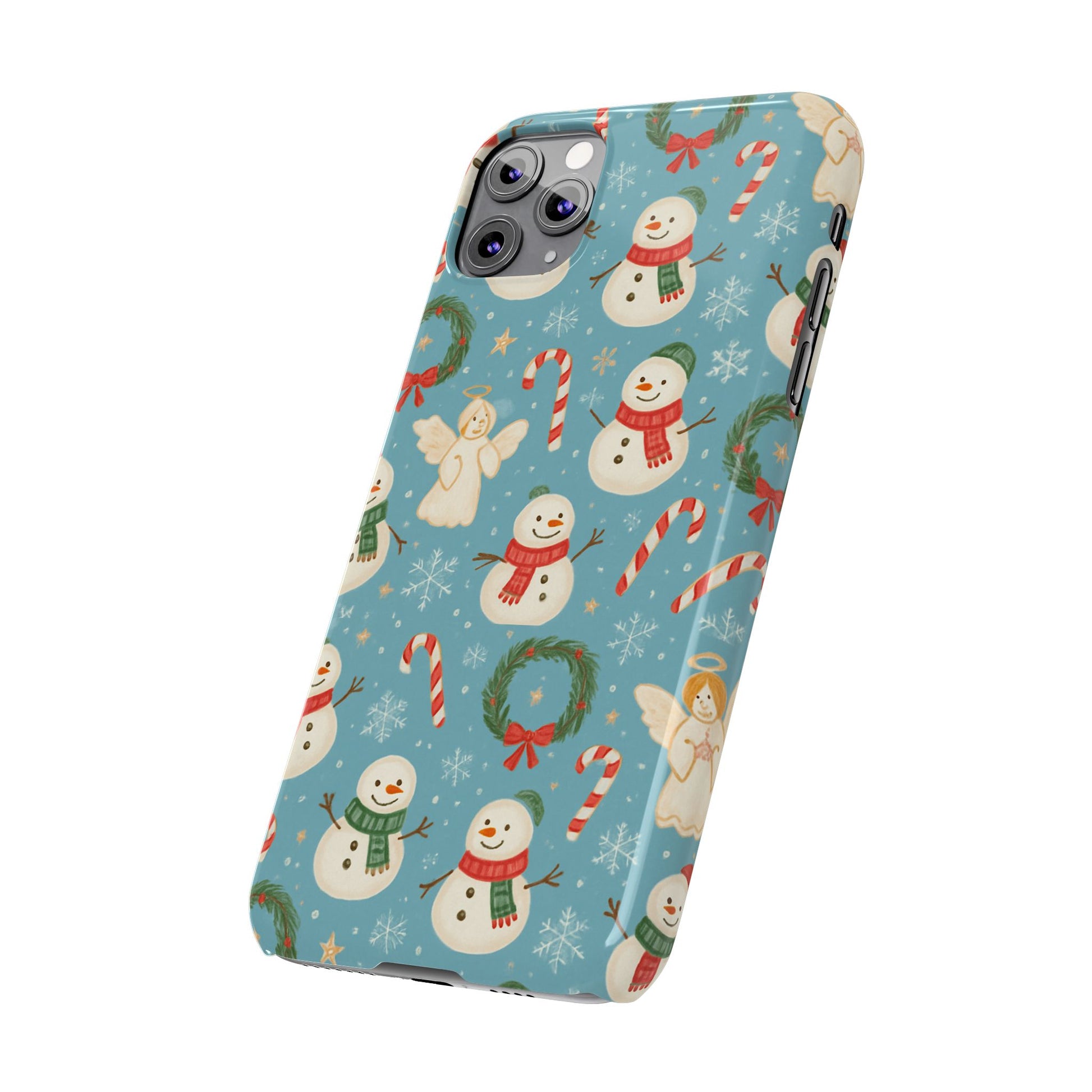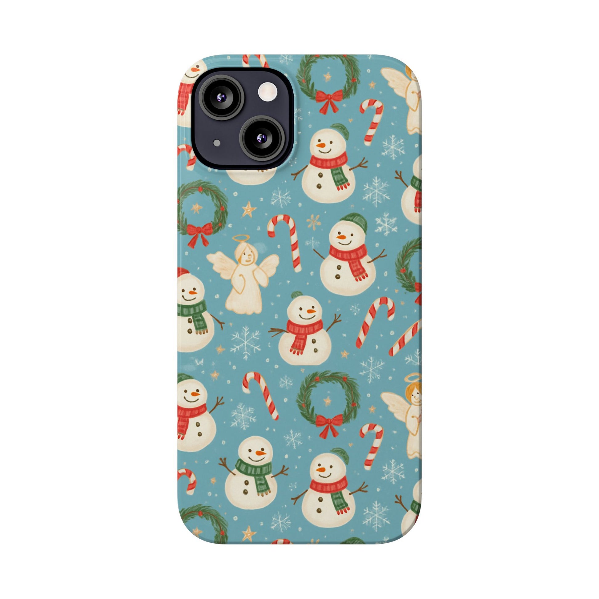Wrap your phone in a little pocket of winter cheer. This slim phone case features a hand-drawn holiday pattern of jolly snowmen, wreaths, candy canes and sweet angels on a soft blue background. It feels lightweight in hand and keeps a glossy, vibrant print that lifts your everyday routine—morning coffee runs, holiday shopping, or porch-lighting nights—into something quietly festive. The low-profile bezel helps keep the screen off surfaces, while the glossy finish makes the colors pop and gives the case a polished look that plays well with coats, mittens, and warm scarves.