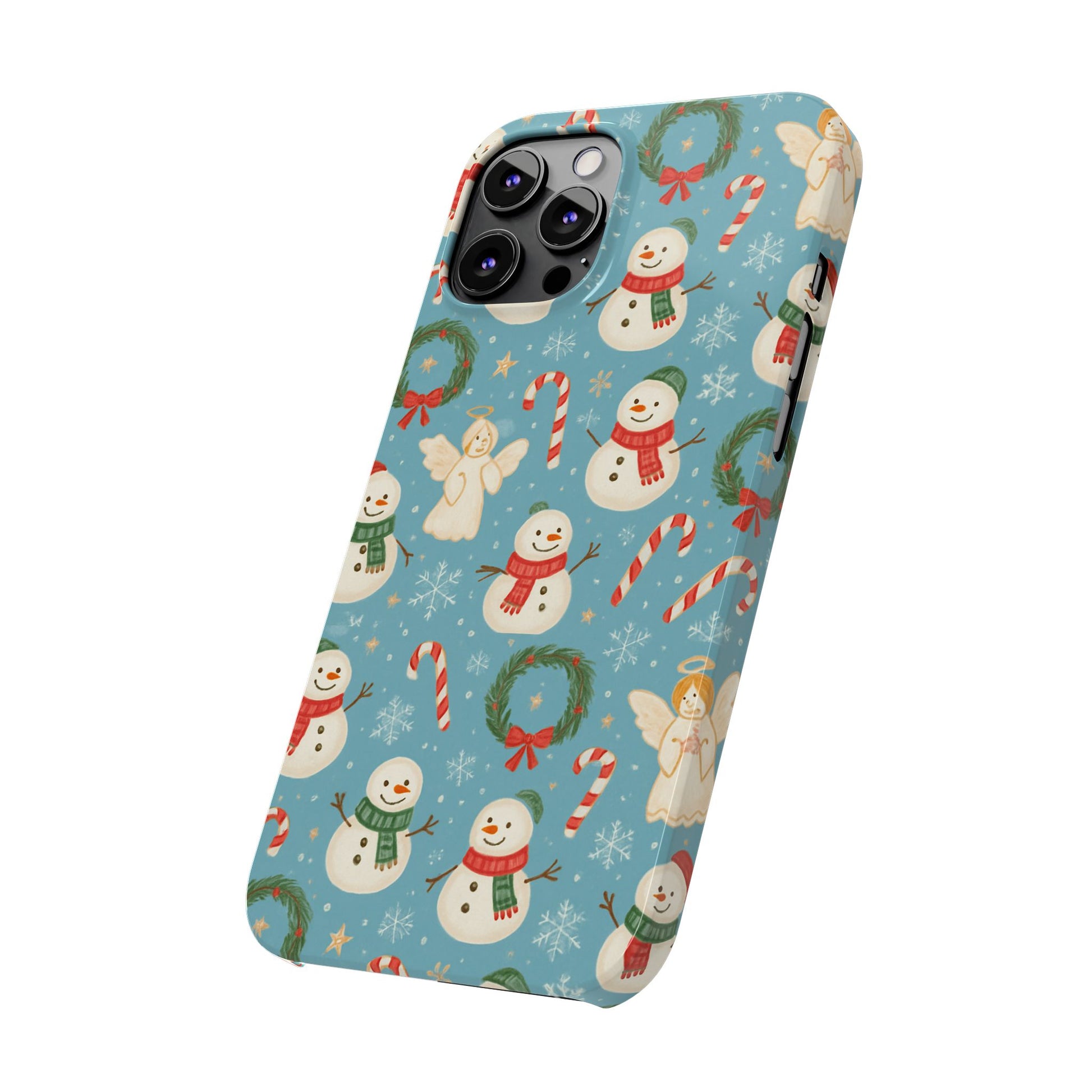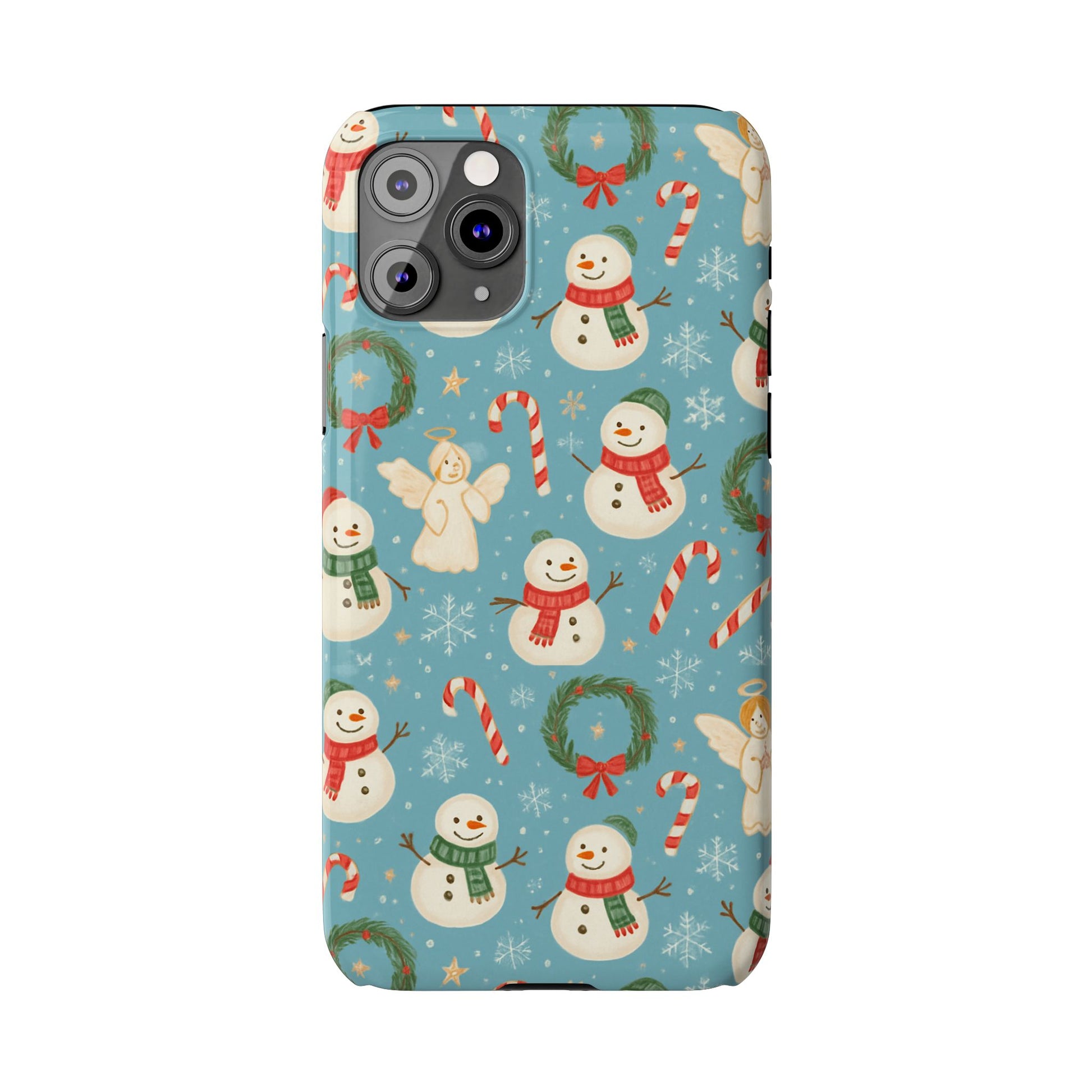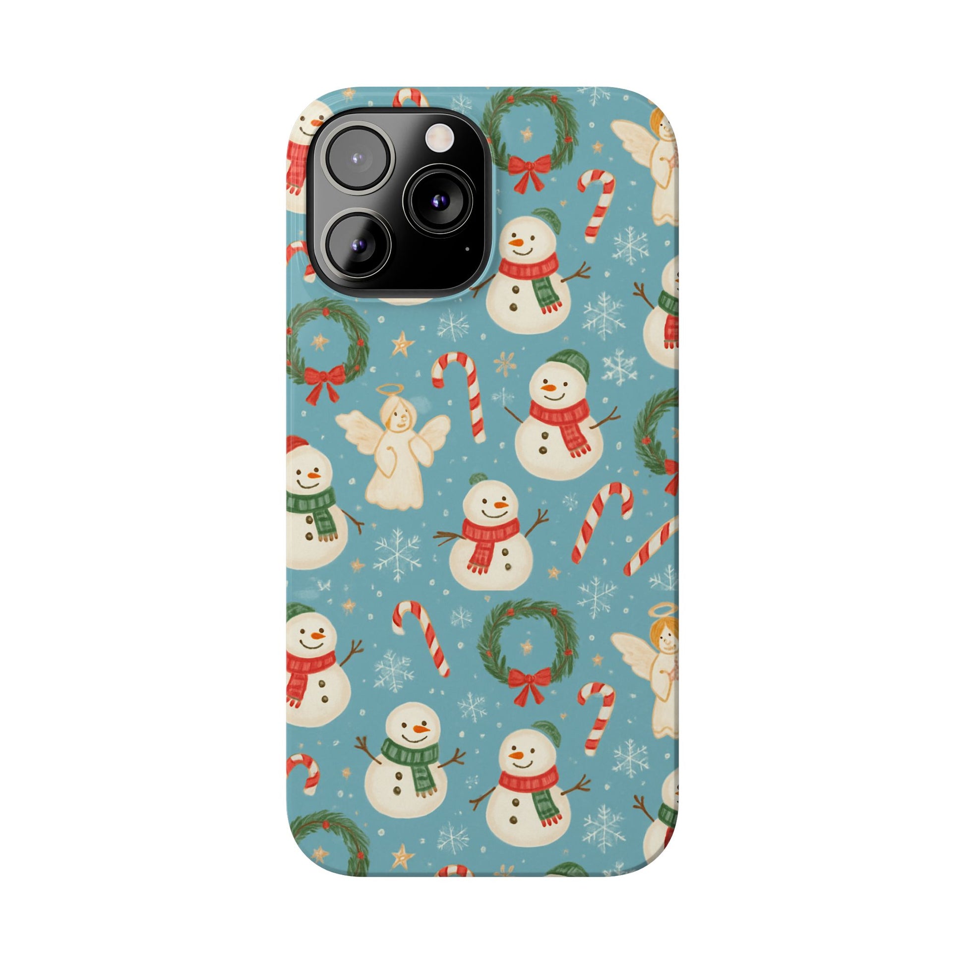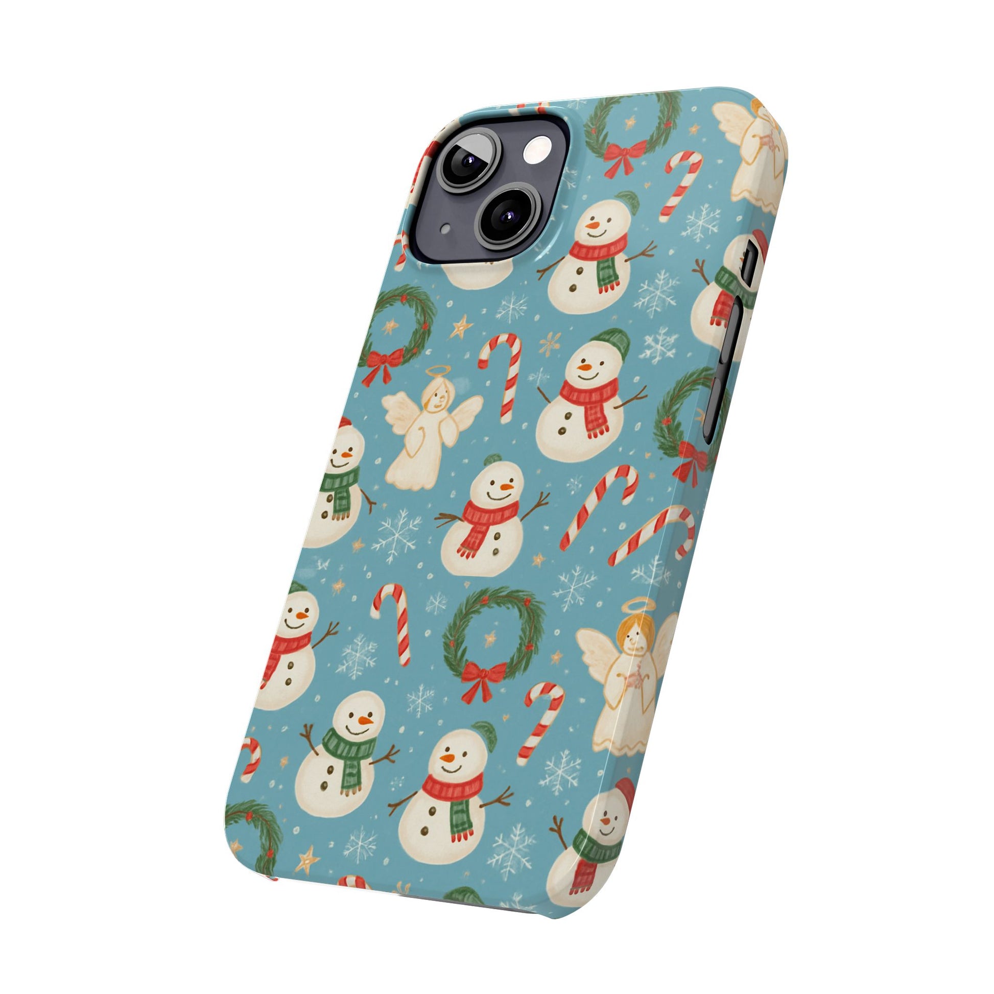 Wrap your phone in a little pocket of winter cheer. This slim phone case features a hand-drawn holiday pattern of jolly snowmen, wreaths, candy canes and sweet angels on a soft blue background. It feels lightweight in hand and keeps a glossy, vibrant print that lifts your everyday routine—morning coffee runs, holiday shopping, or porch-lighting nights—into something quietly festive. The low-profile bezel helps keep the screen off surfaces, while the glossy finish makes the colors pop and gives the case a polished look that plays well with coats, mittens, and warm scarves.