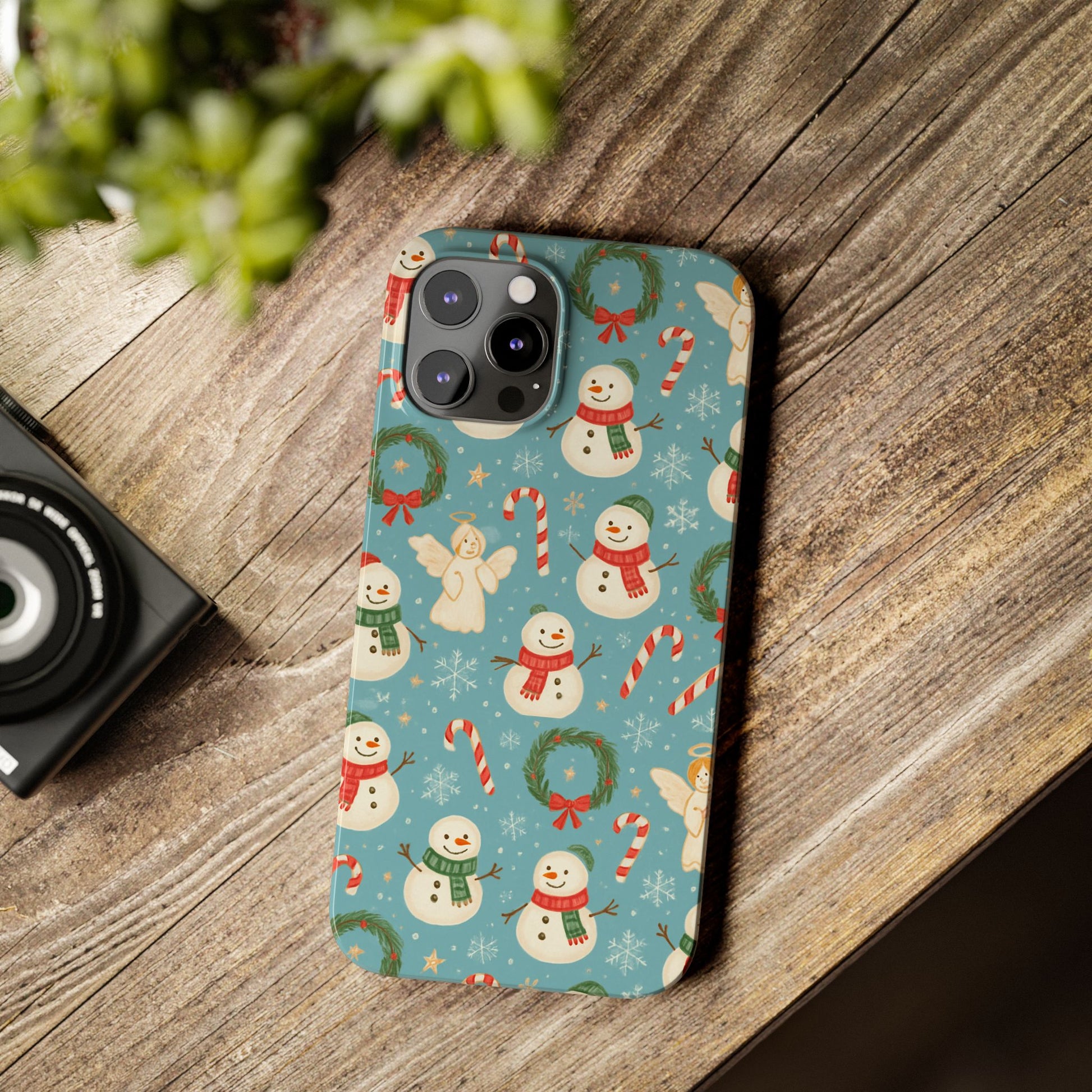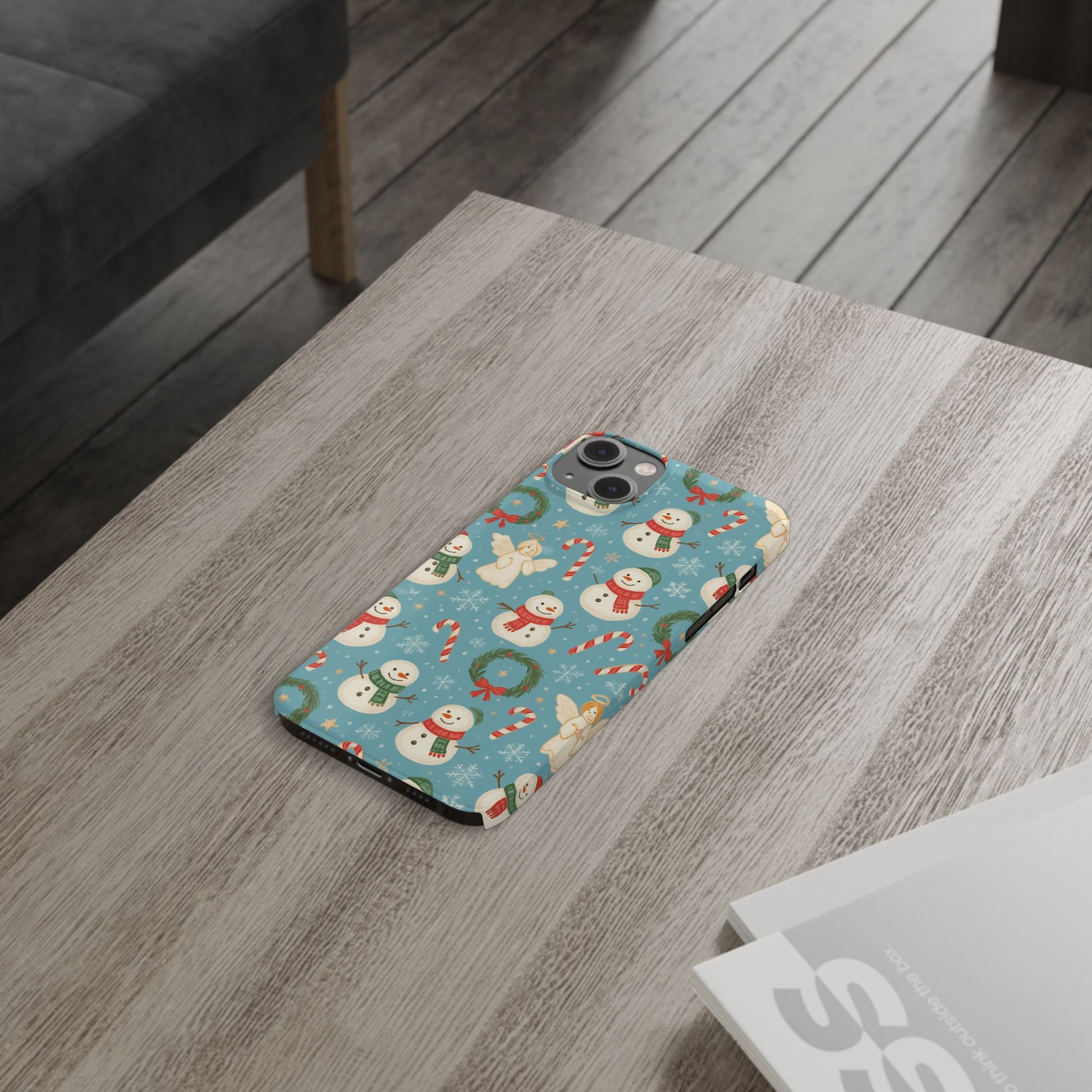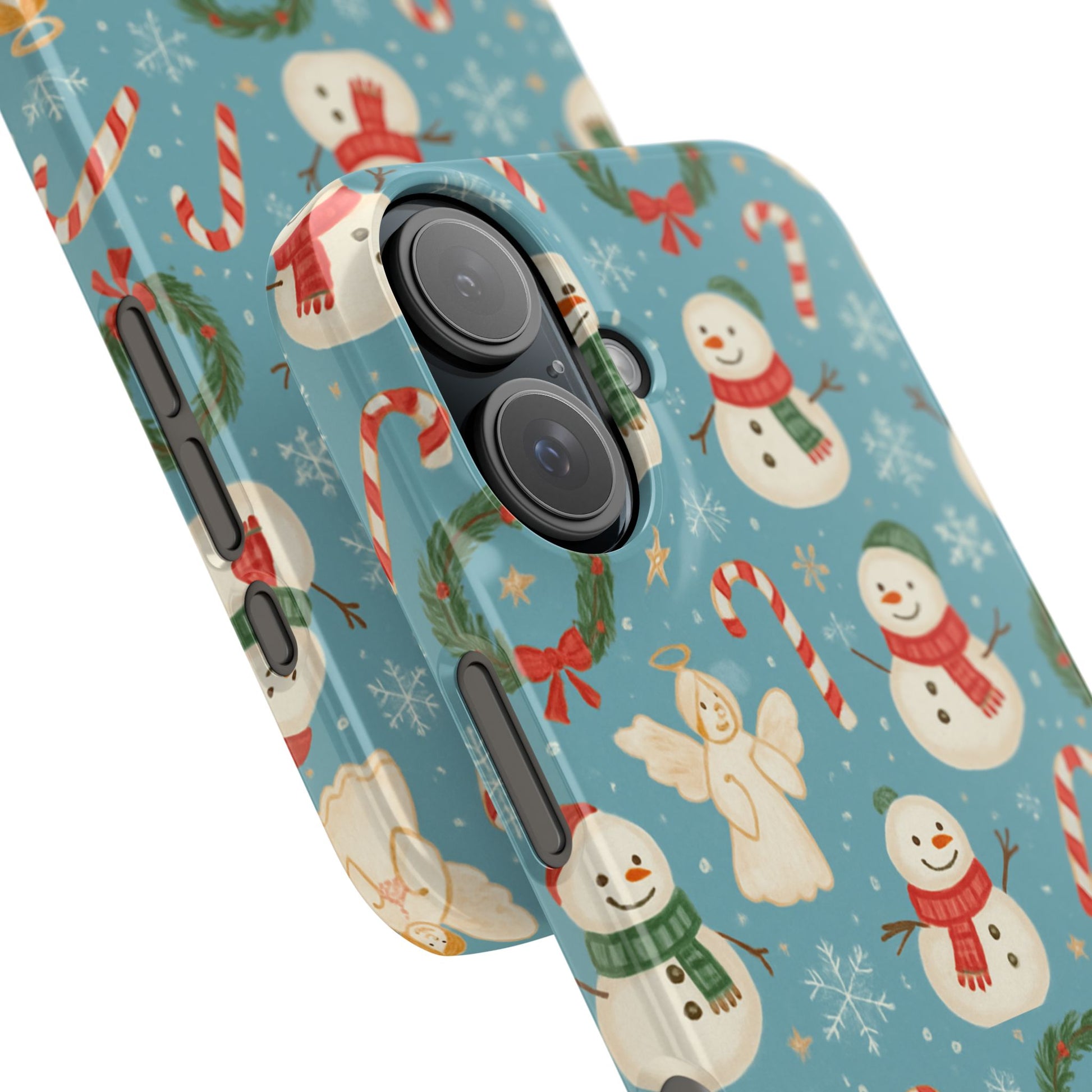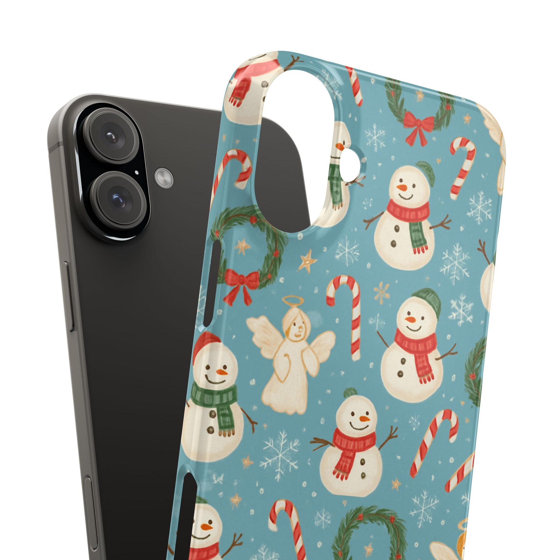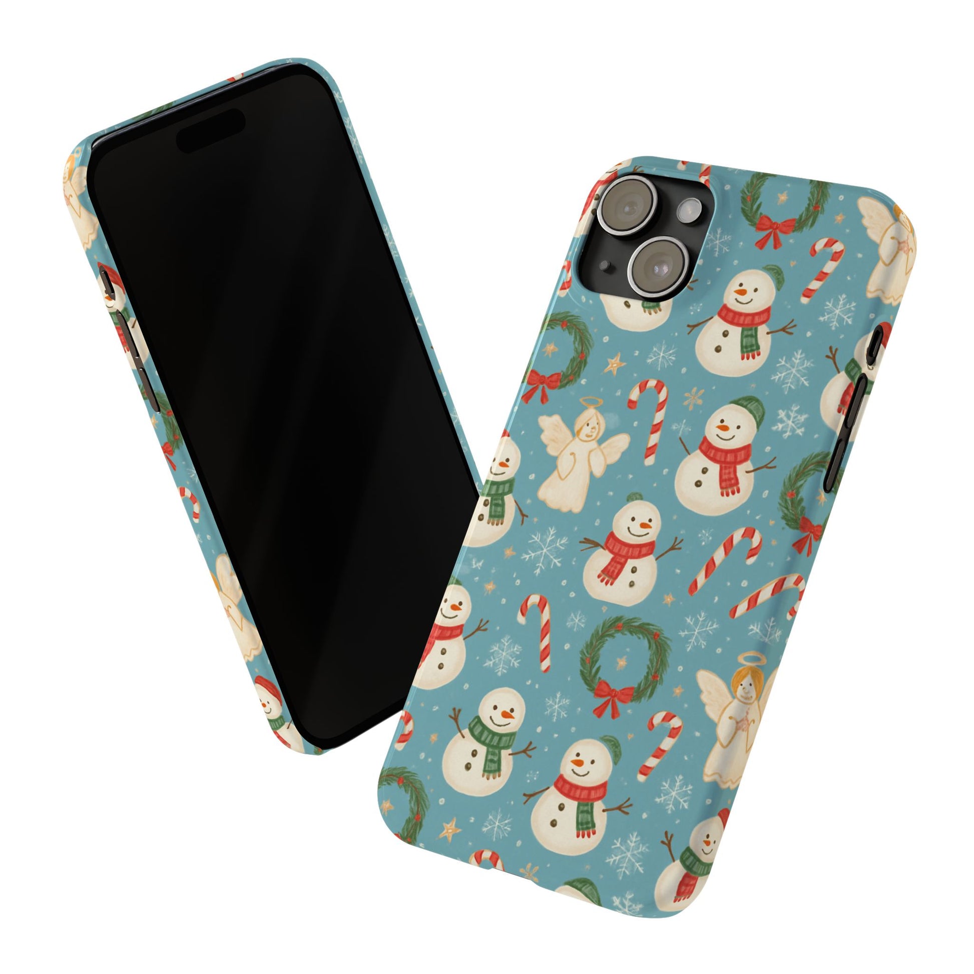 Wrap your phone in a little pocket of winter cheer. This slim phone case features a hand-drawn holiday pattern of jolly snowmen, wreaths, candy canes and sweet angels on a soft blue background. It feels lightweight in hand and keeps a glossy, vibrant print that lifts your everyday routine—morning coffee runs, holiday shopping, or porch-lighting nights—into something quietly festive. The low-profile bezel helps keep the screen off surfaces, while the glossy finish makes the colors pop and gives the case a polished look that plays well with coats, mittens, and warm scarves.