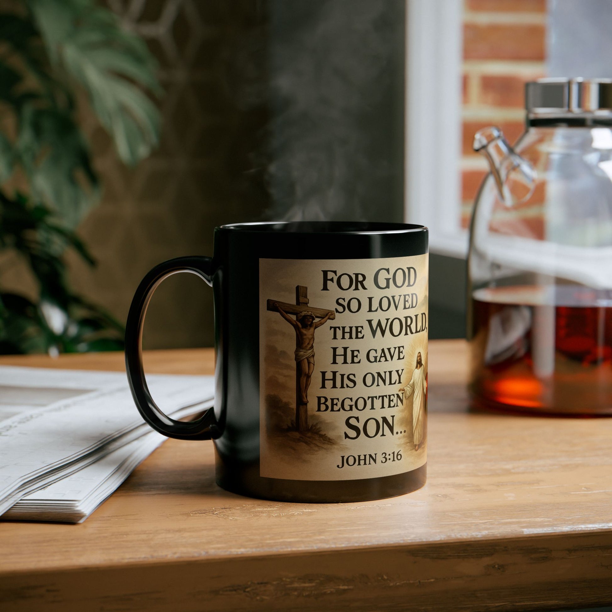 Mug that speaks to quiet mornings and steady faith. Hold it and feel the cool, glossy black against your palms as the bold white lettering of John 3:16 stands clear above warm coffee or tea. The first sip before morning devotion, a pause between errands, or late-night reading by lamplight. It’s made for those who carry scripture into daily life and want a simple, honest reminder of hope every time they reach for a drink.
