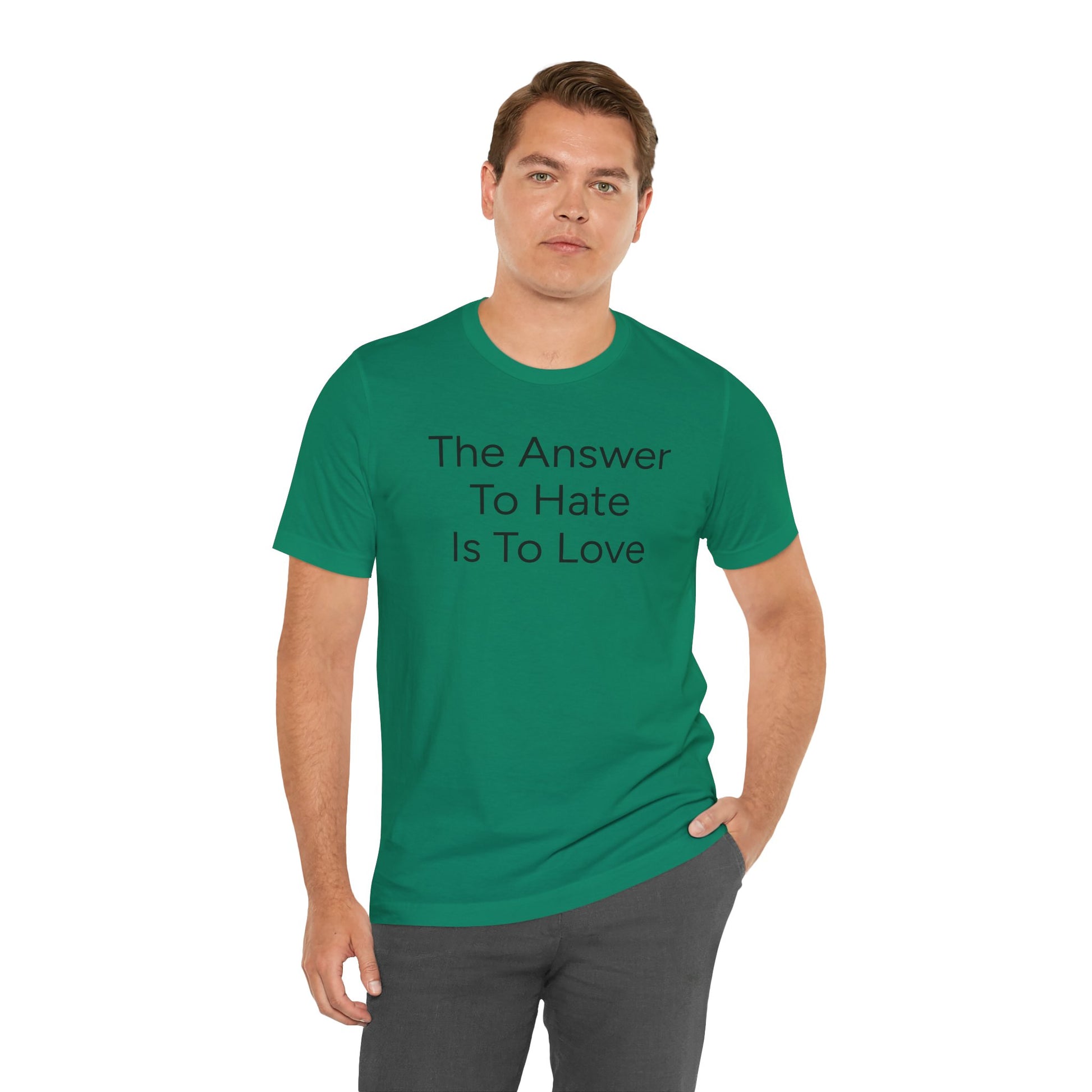 Spread a message of love with this unisex t-shirt featuring the phrase 'The Answer To Hate Is To Love'. Perfect for anyone looking to wear a positive statement and promote kindness and compassion. Ideal for casual wear and as a thoughtful gift for friends and family. Relevant for holidays such as Valentine's Day, World Kindness Day, and International Day of Peace.