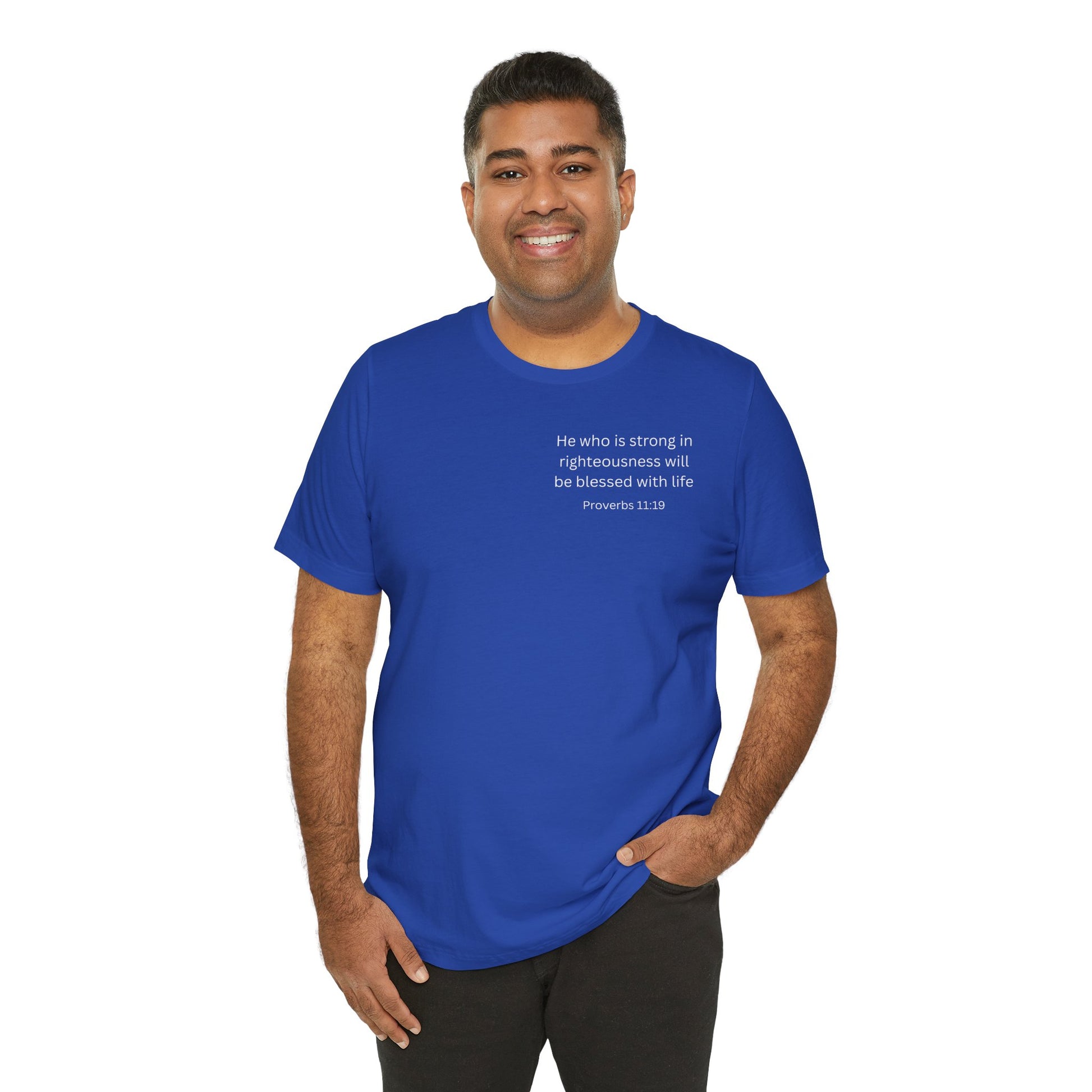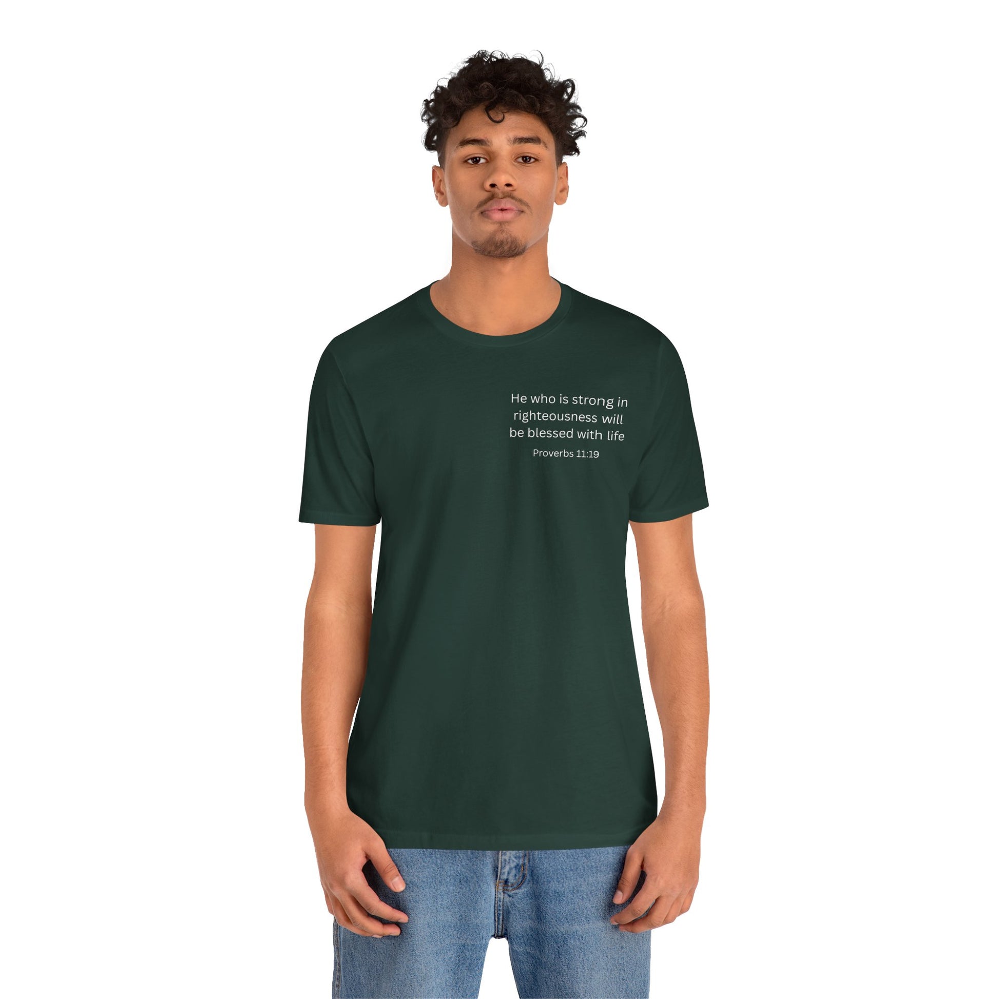 T-Shirt features the quote 'He who is strong in righteousness will be blessed with life' Prov. 11:19 in small, subtle lettering on the upper left part of the shirt. It gives a spiritual and positive vibe, perfect for those looking to express their faith in a casual yet meaningful way. Ideal for Christians celebrating religious holidays and events like Easter and Christmas.